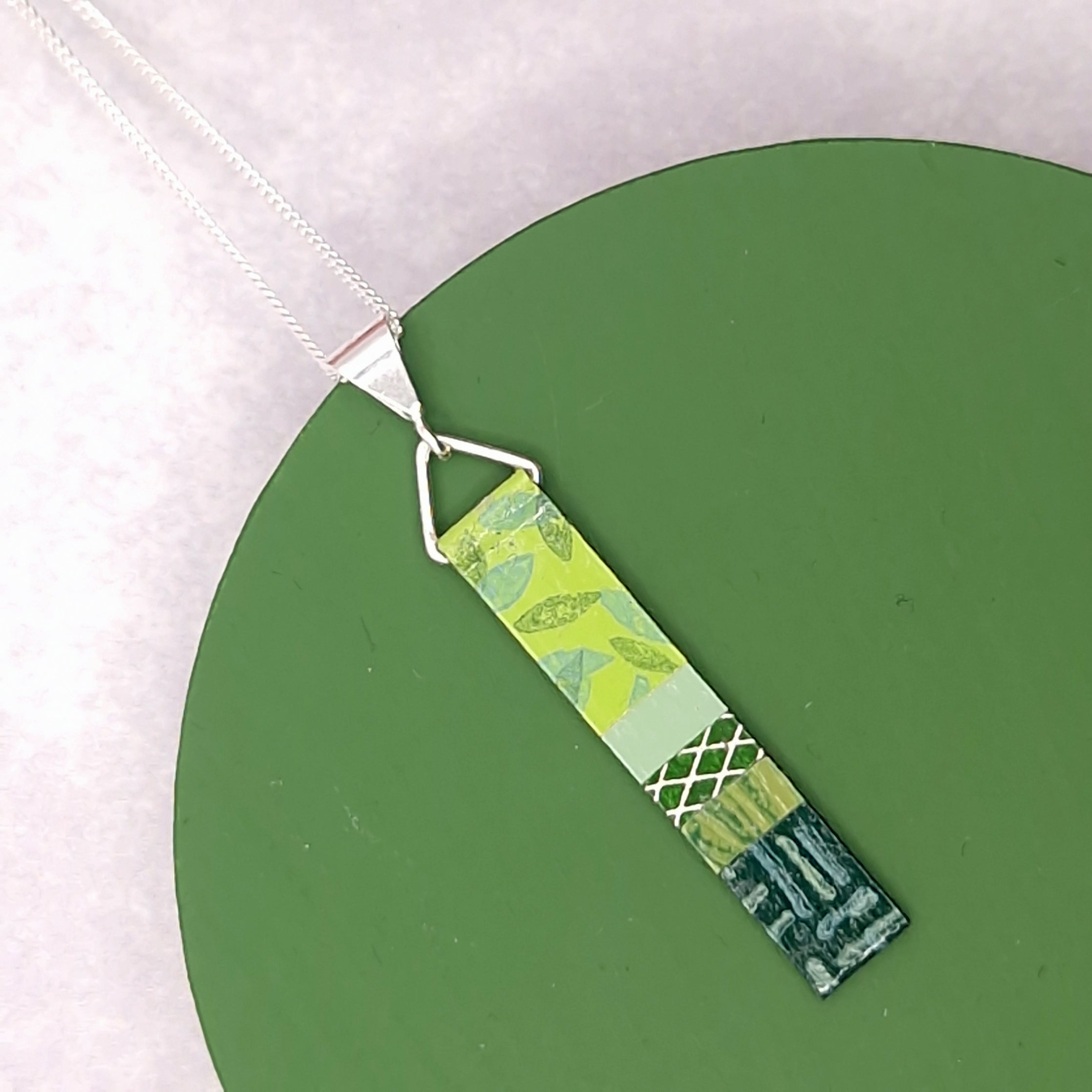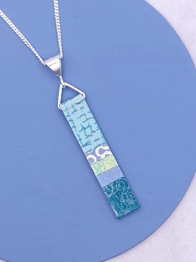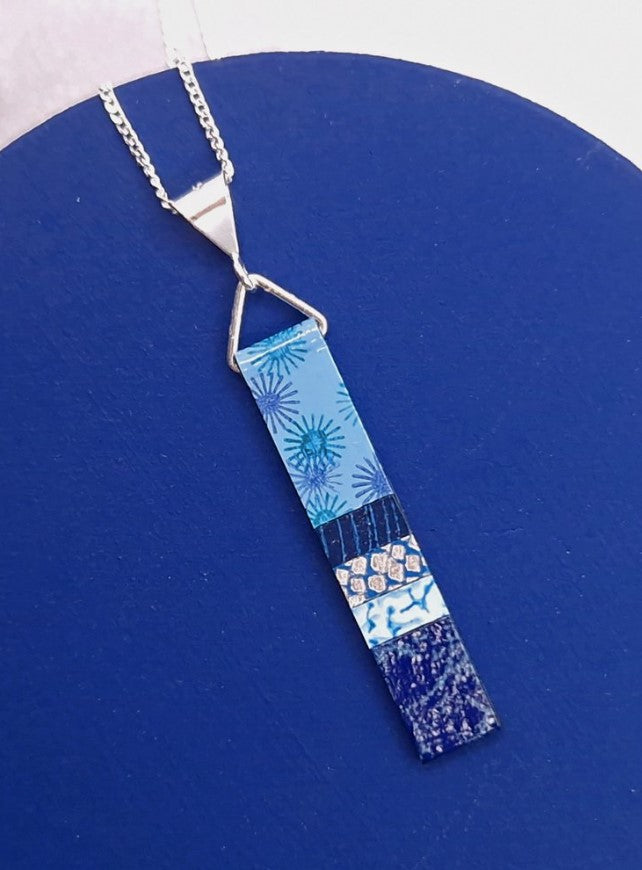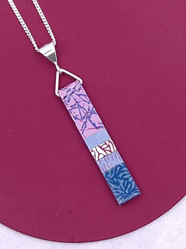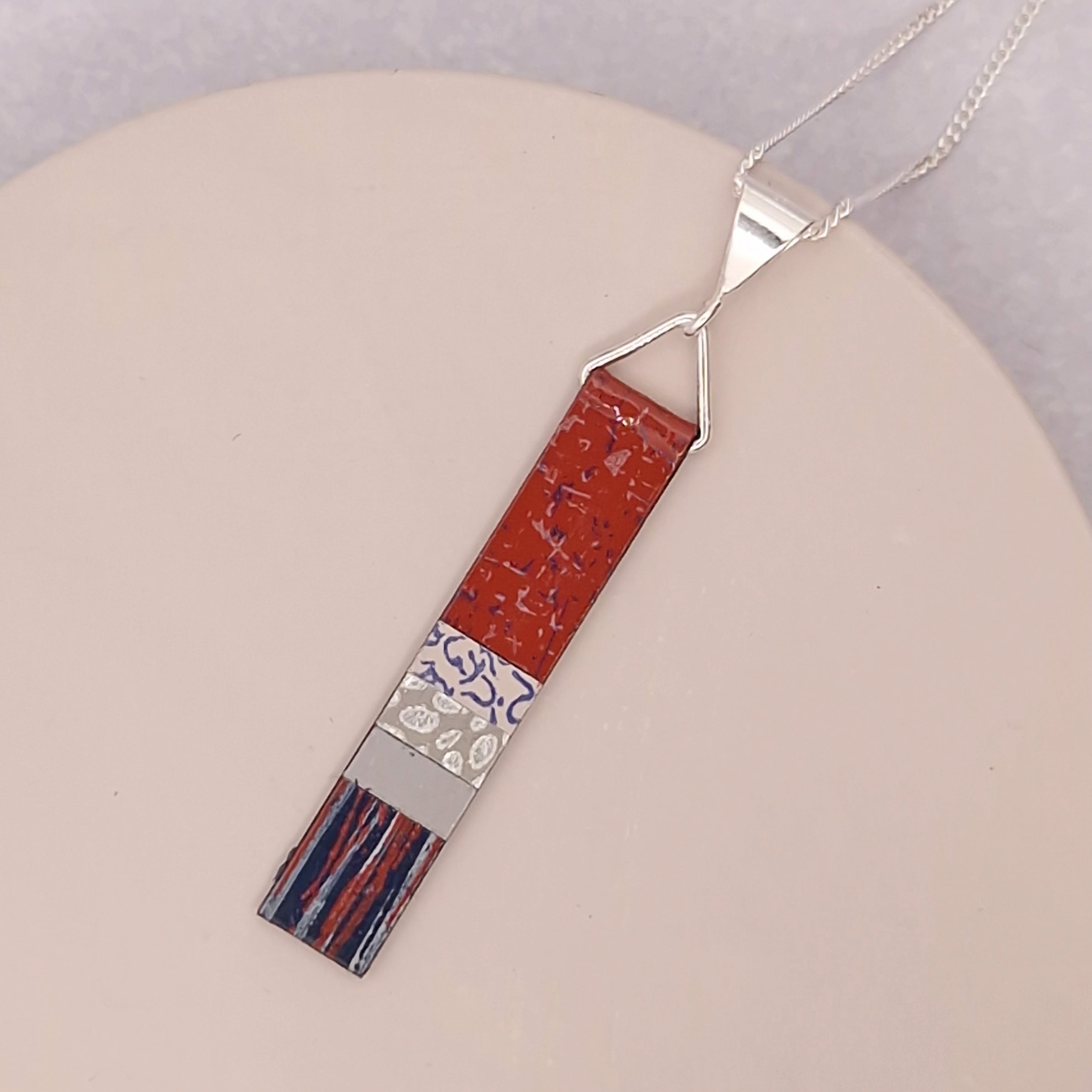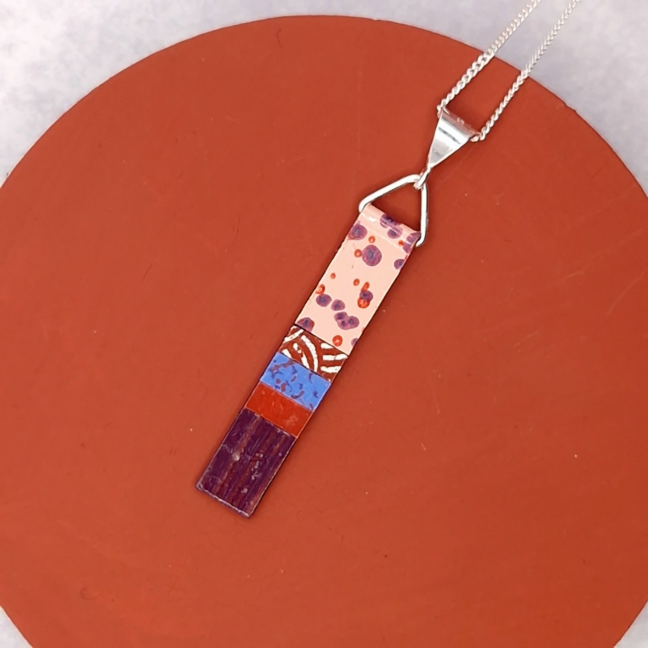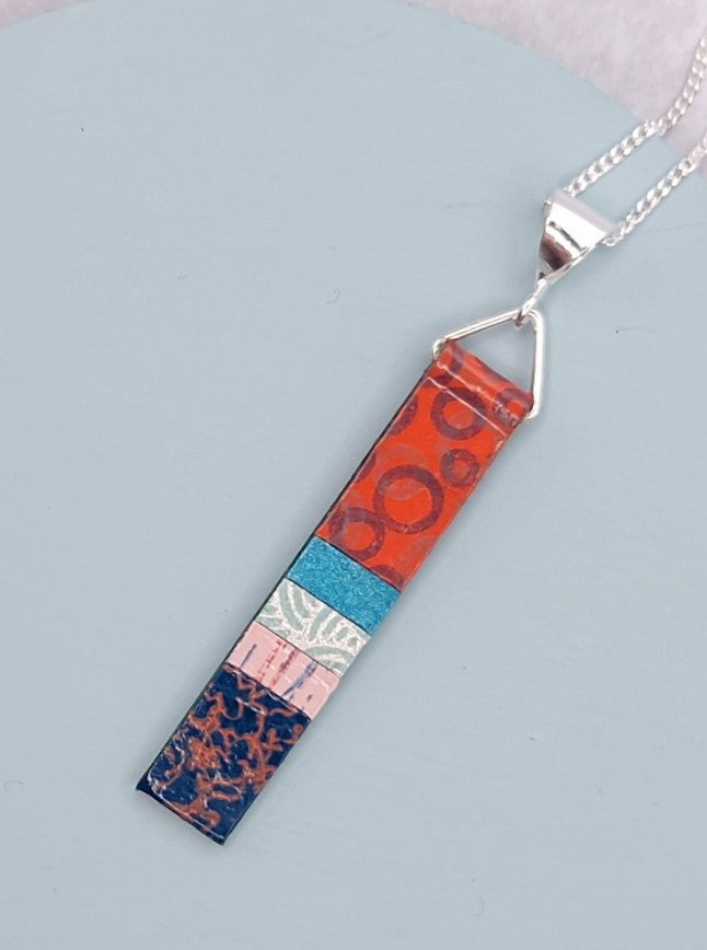 This Long Slim Pendant gives an iconic and colourful look, and is handmade from layers of hand-painted, printed & gilded papers, with sterling silver bail and Chain. Several patterns are combined to create the final piece and they are sealed with enamel lacquer for protection.