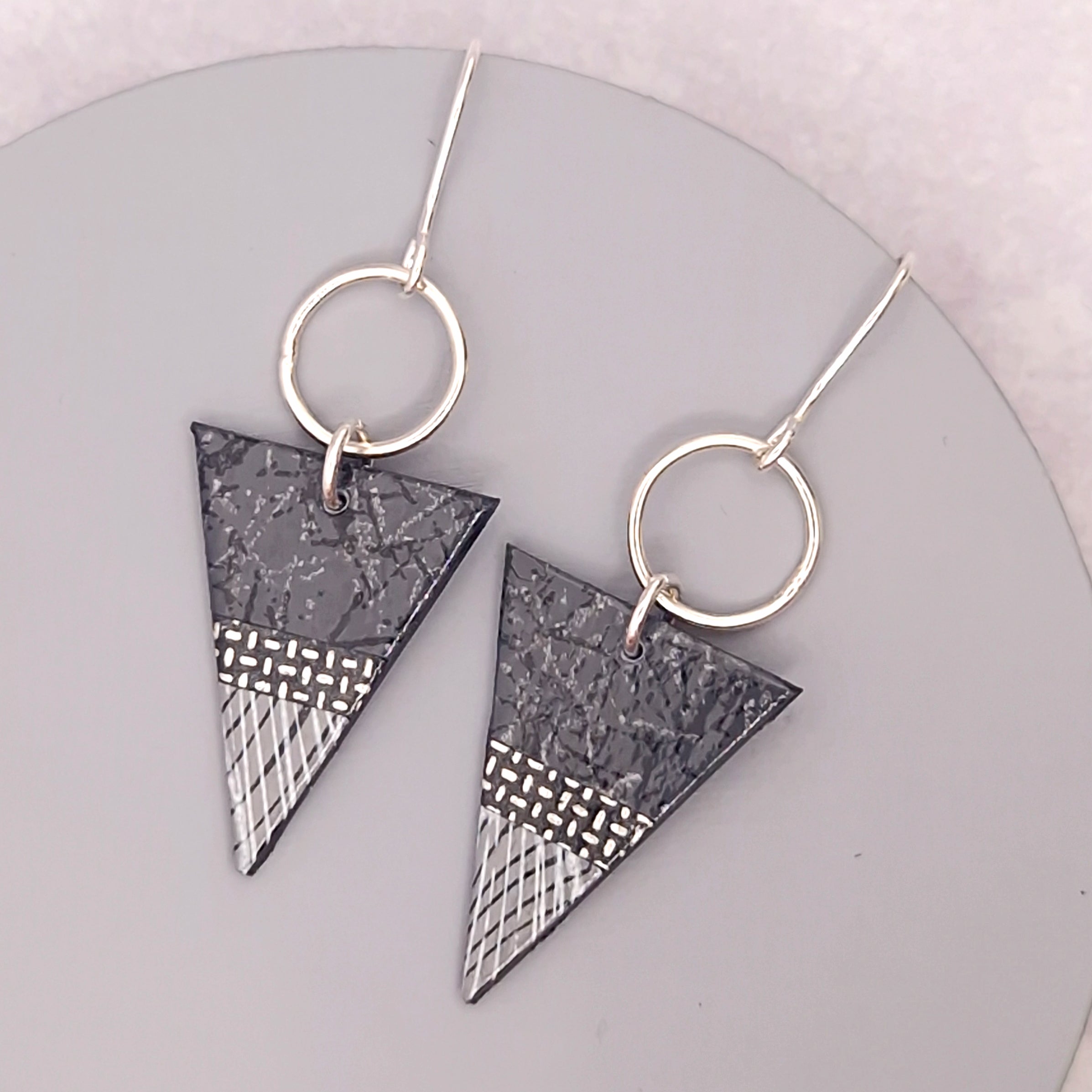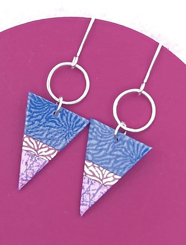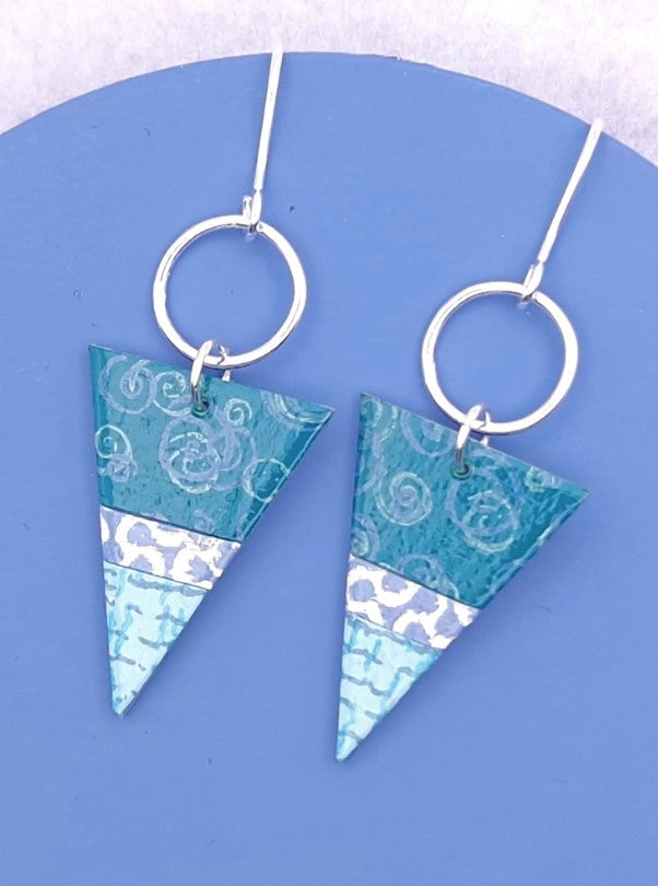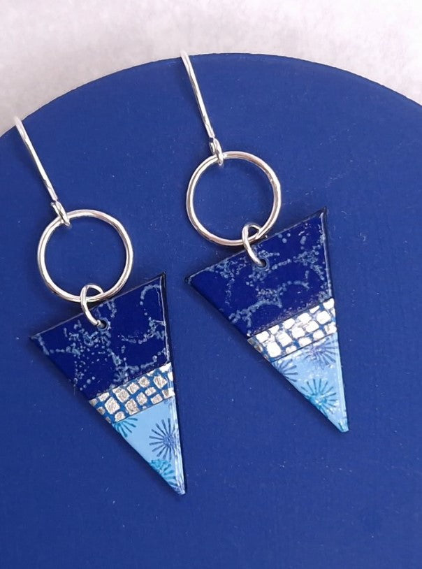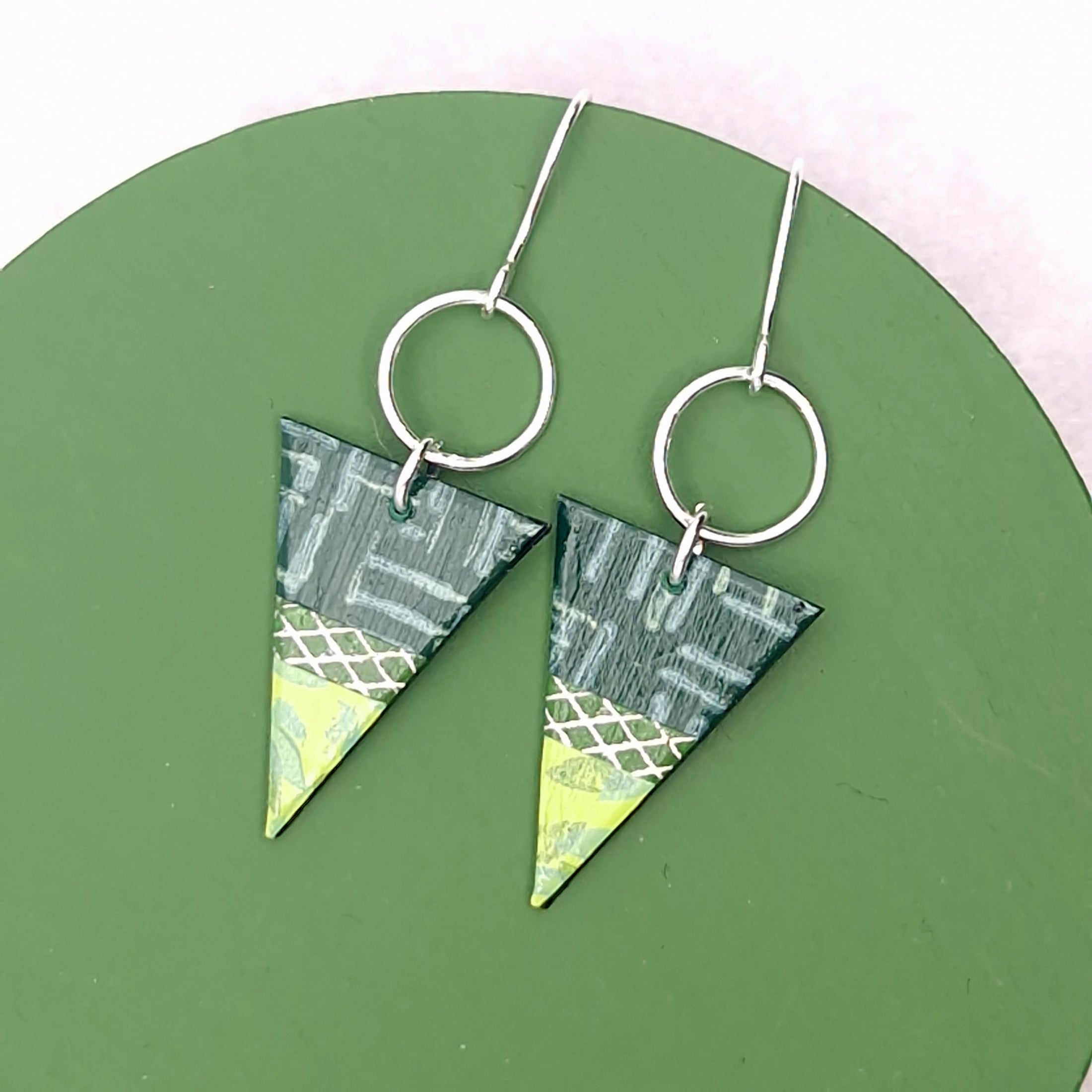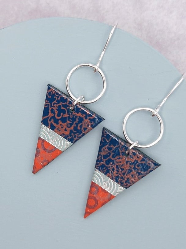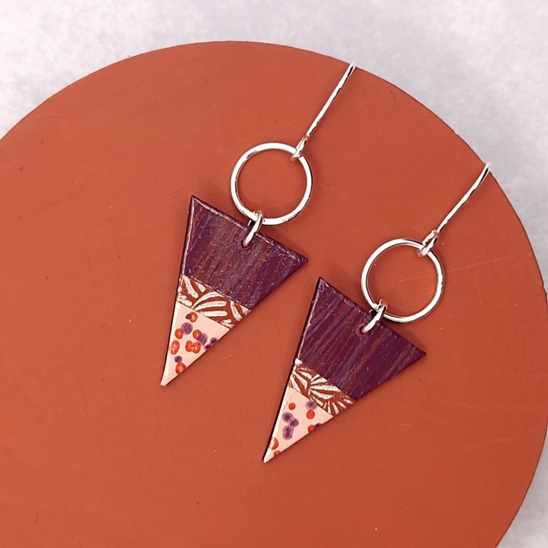 The distinct, eye-catching Triangle earrings are handmade from layers of hand-painted, printed and gilded papers, with sterling silver links and hooks. Several patterns are combined to create the final piece and they are sealed with enamel lacquer for protection.