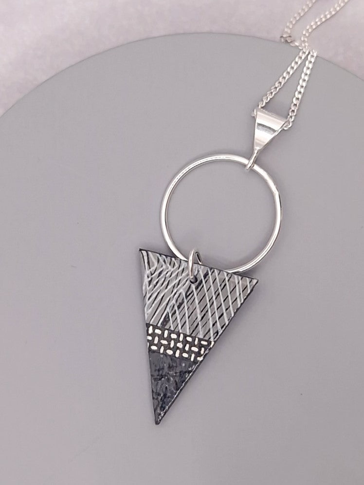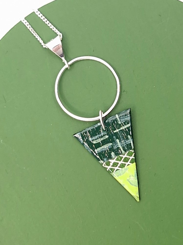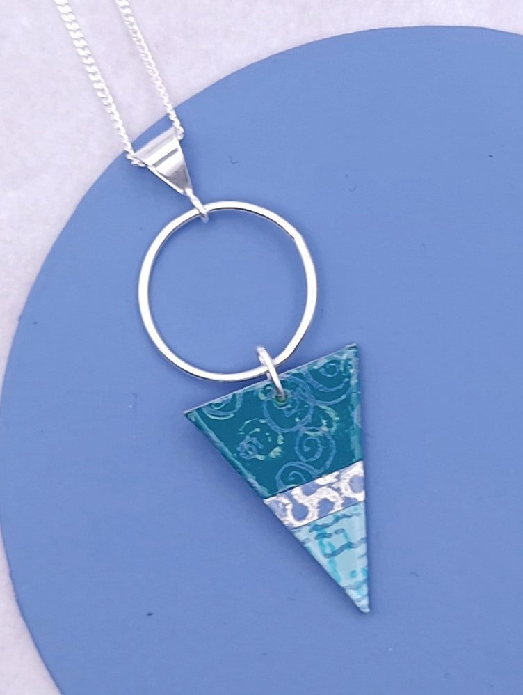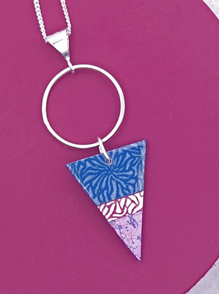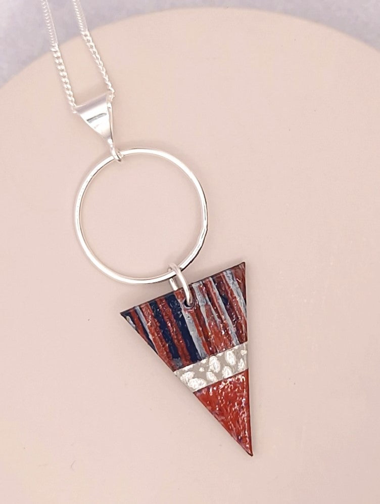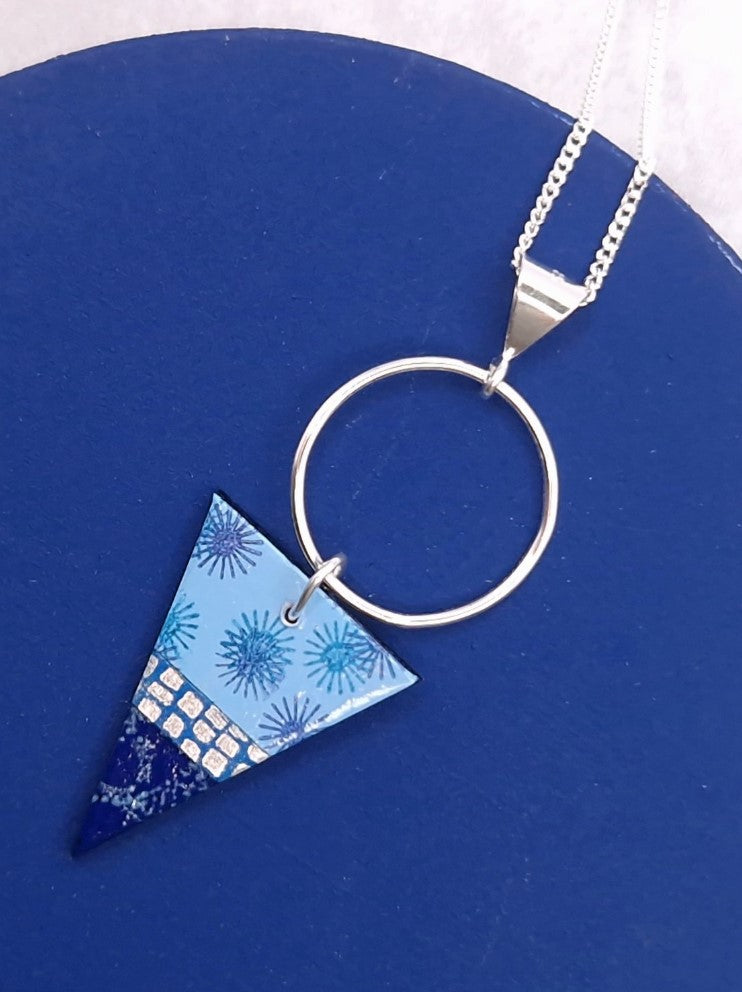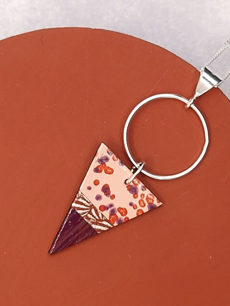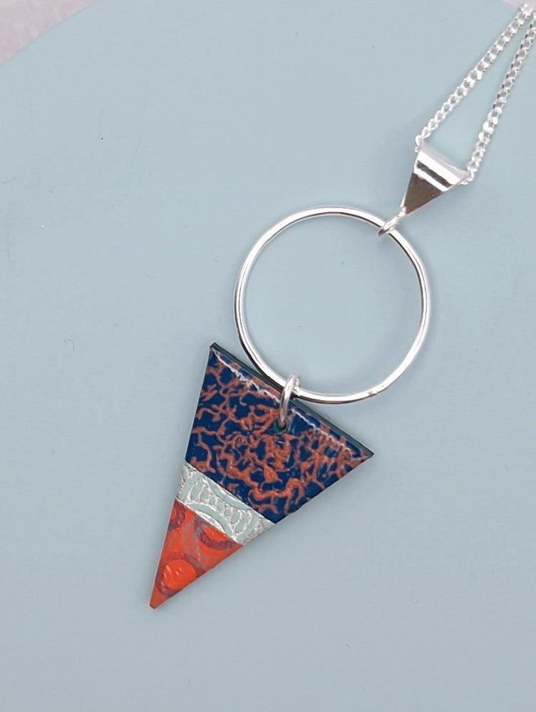 The distinct, eye-catching Triangle pendant is handmade from layers of hand-painted, printed & gilded papers, with sterling silver links and chain. Several patterns are combined to create the final piece and they are sealed with enamel lacquer for protection.