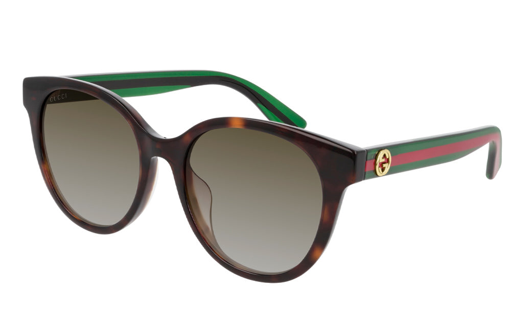 Bold-framed glasses and sunglasses characterize the Gucci eyewear line for women, from classic aviators to cat-eyes and crystal Hollywood Forever styles.