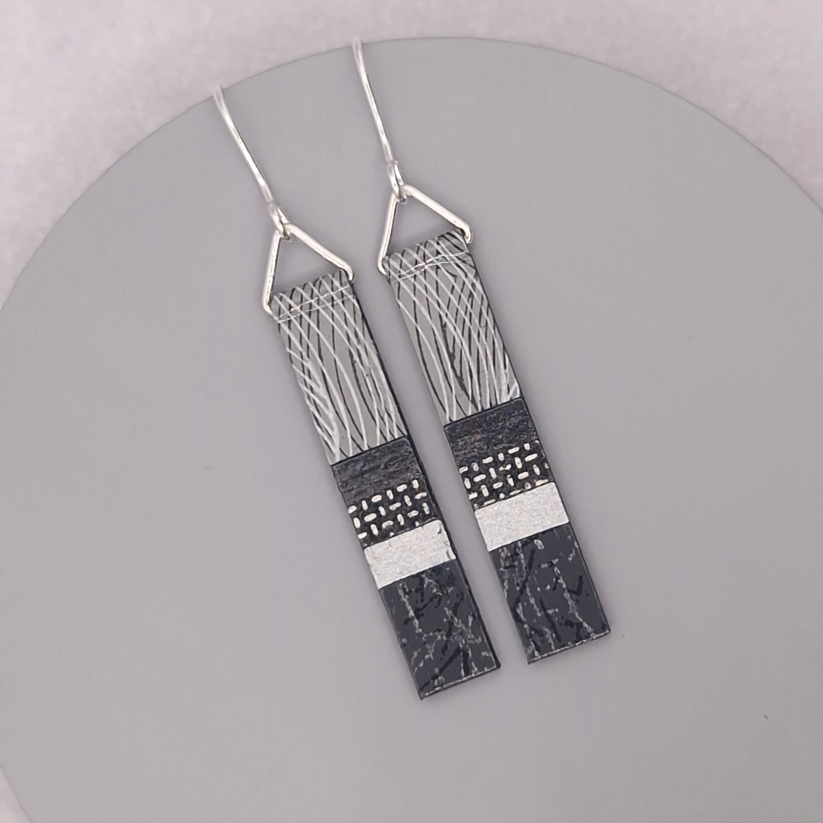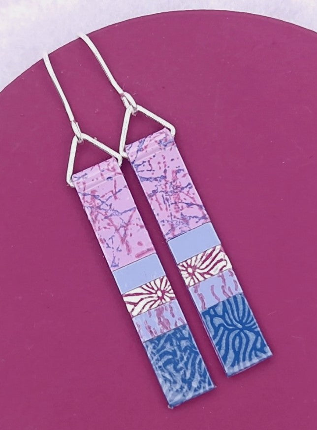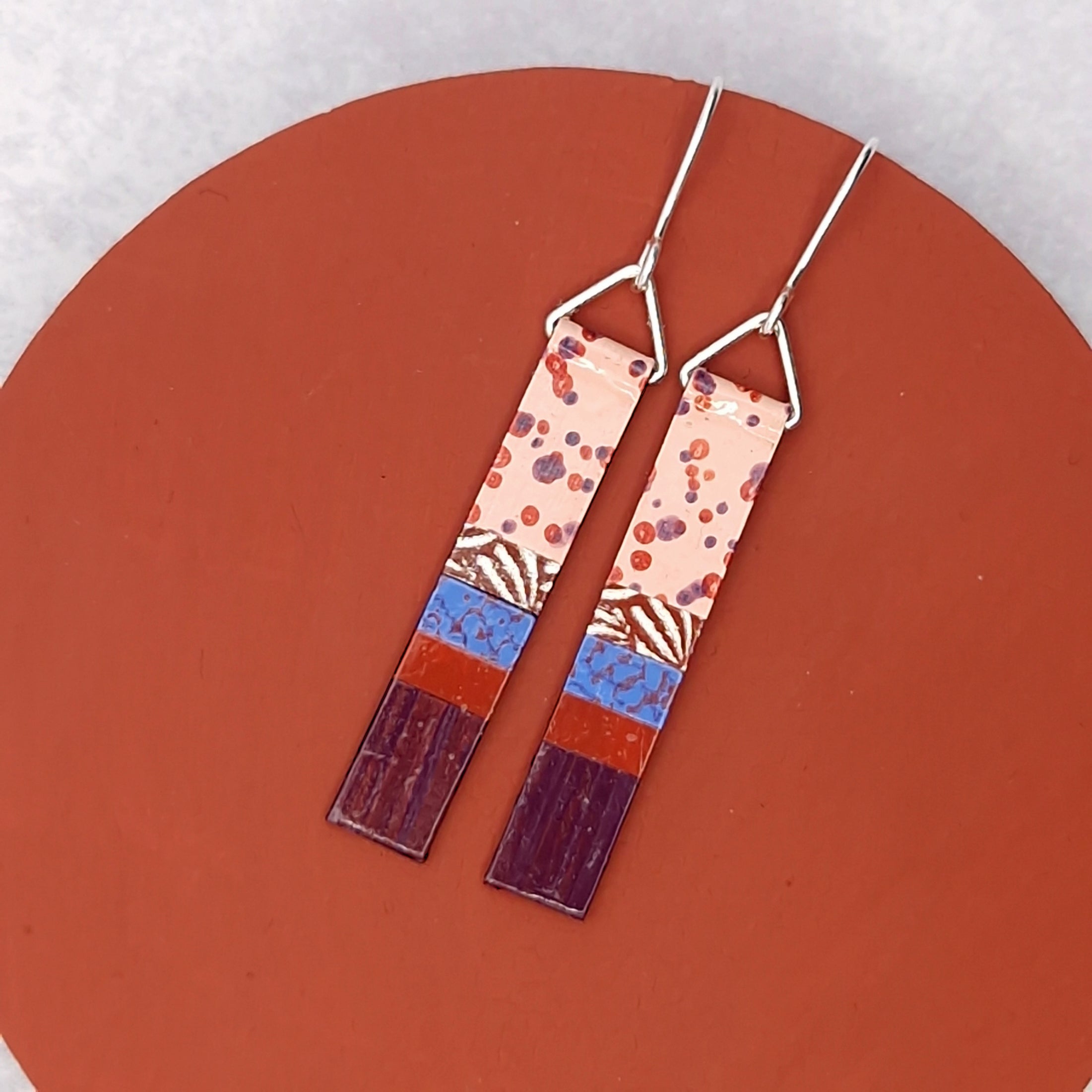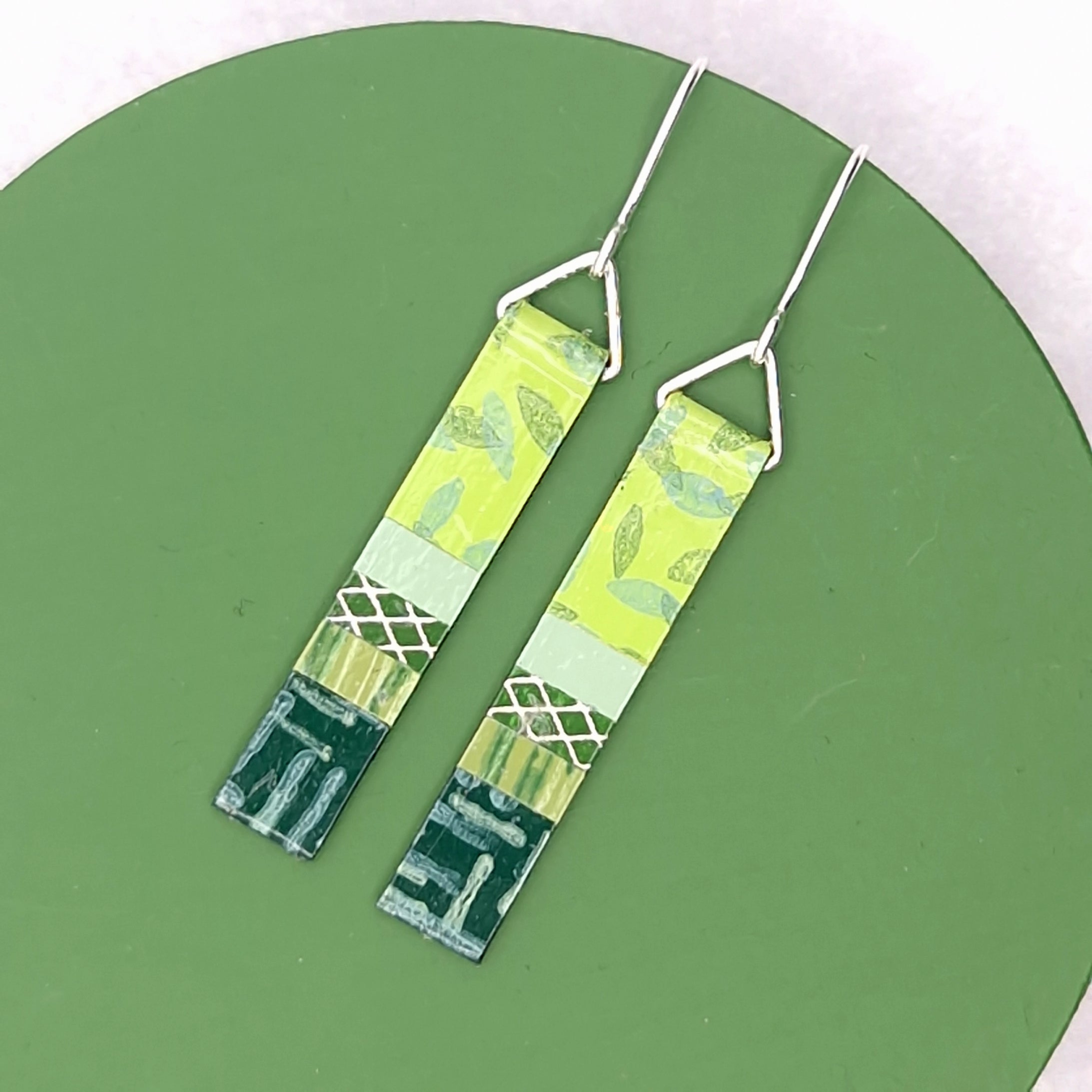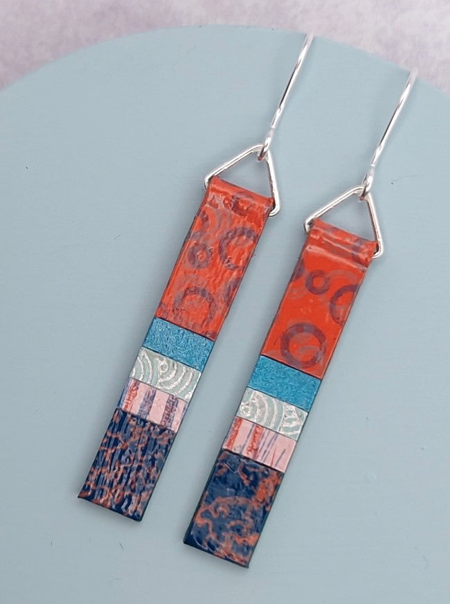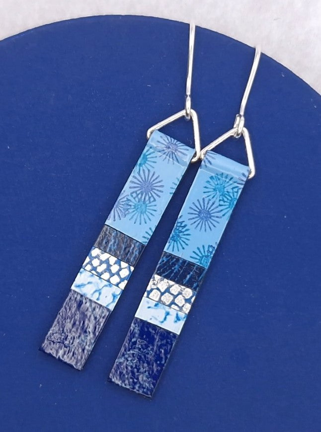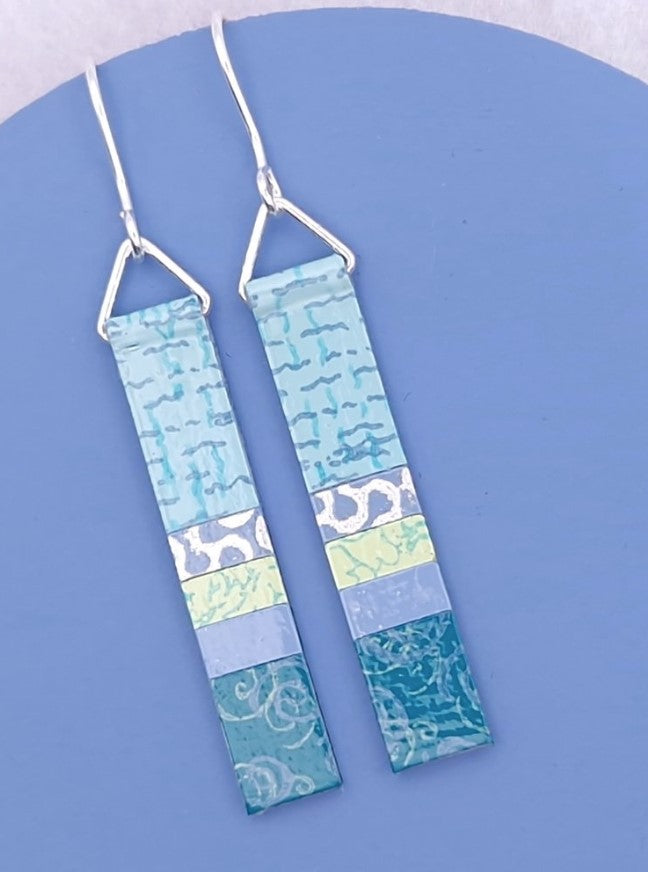 Long slim earrings made from hand-painted papers that we paint and print in our UK Studio. Finished with enamel lacquer they are lightweight and durable with Sterling Silver hooks.