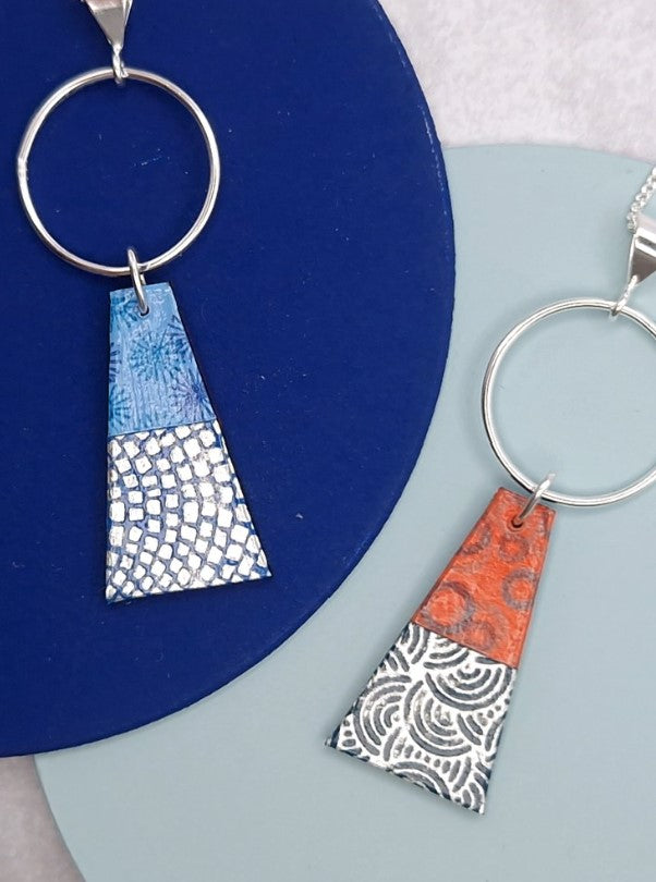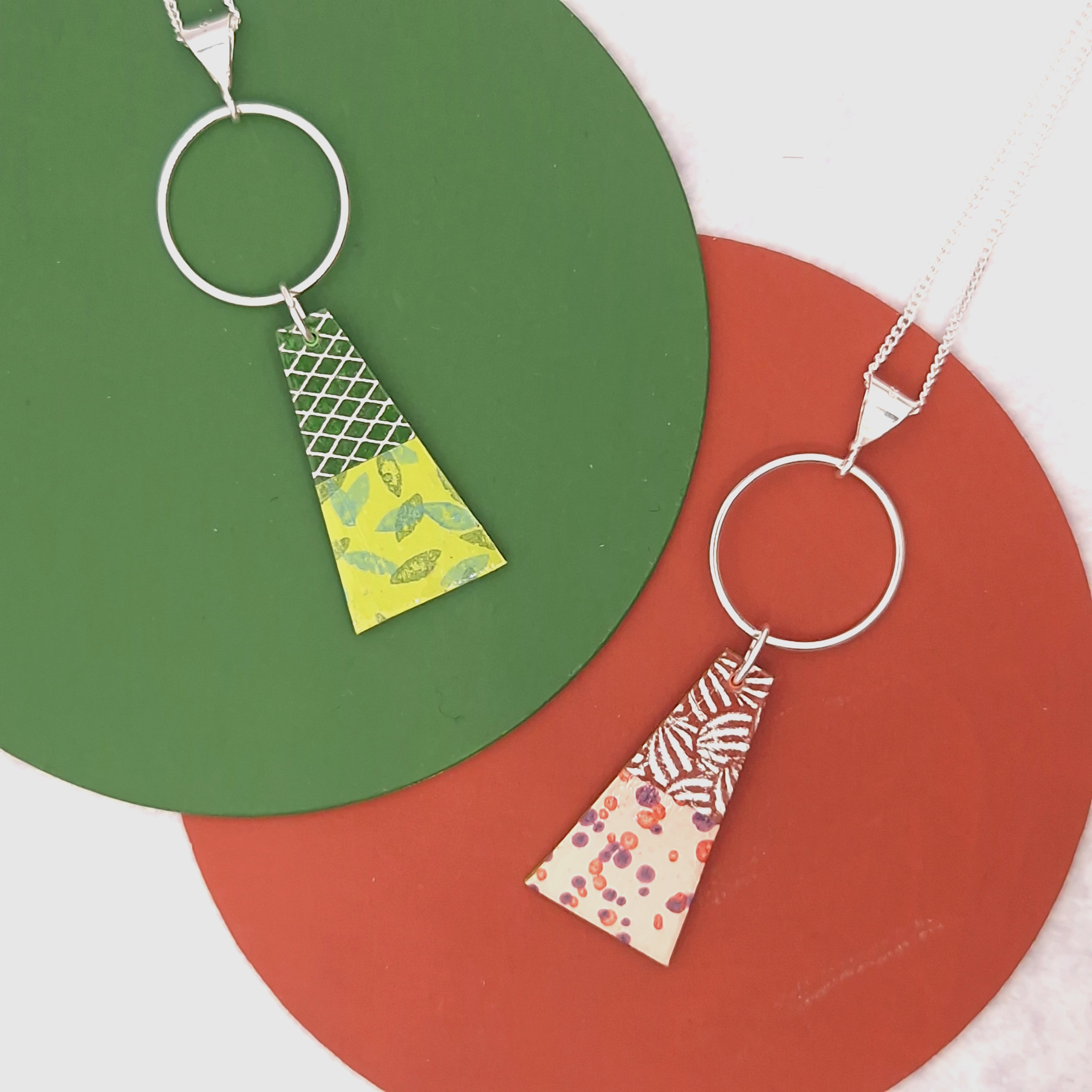 Trapeze-shaped pendant made from hand-painted and gilded papers that we paint and print in our UK studio. Finished with enamel lacquer they are lightweight and durable with sterling silver links and chain. Gorgeous and delicate necklaces for a special friend.