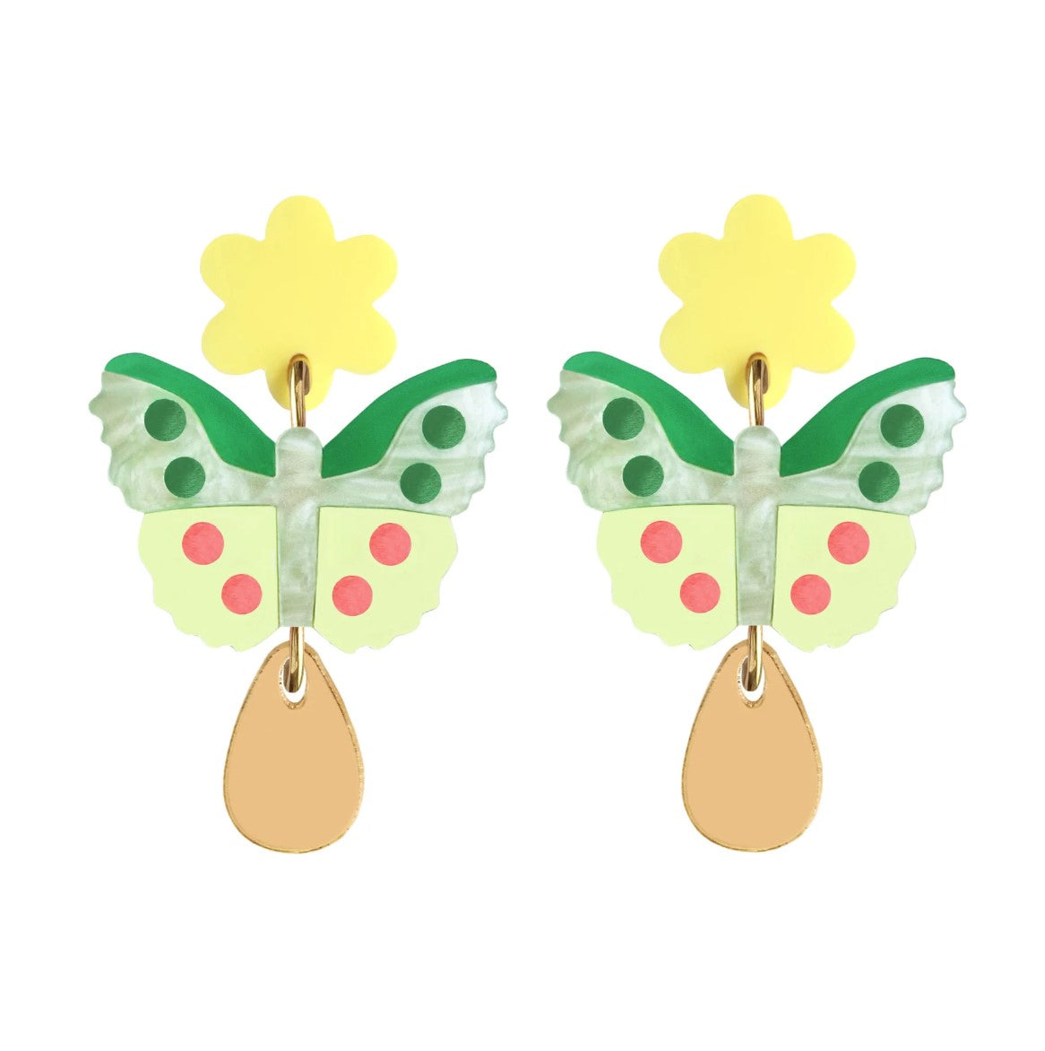 They feature a zingy yellow flower shape attached to a butterfly motif made from frost green, pastel green and a shimmery light green pearl effect acrylic, with a high-shine gold mirror teardrop shape. They are then finished with hand-painted details.