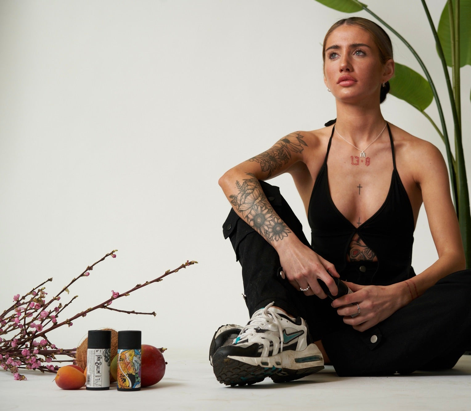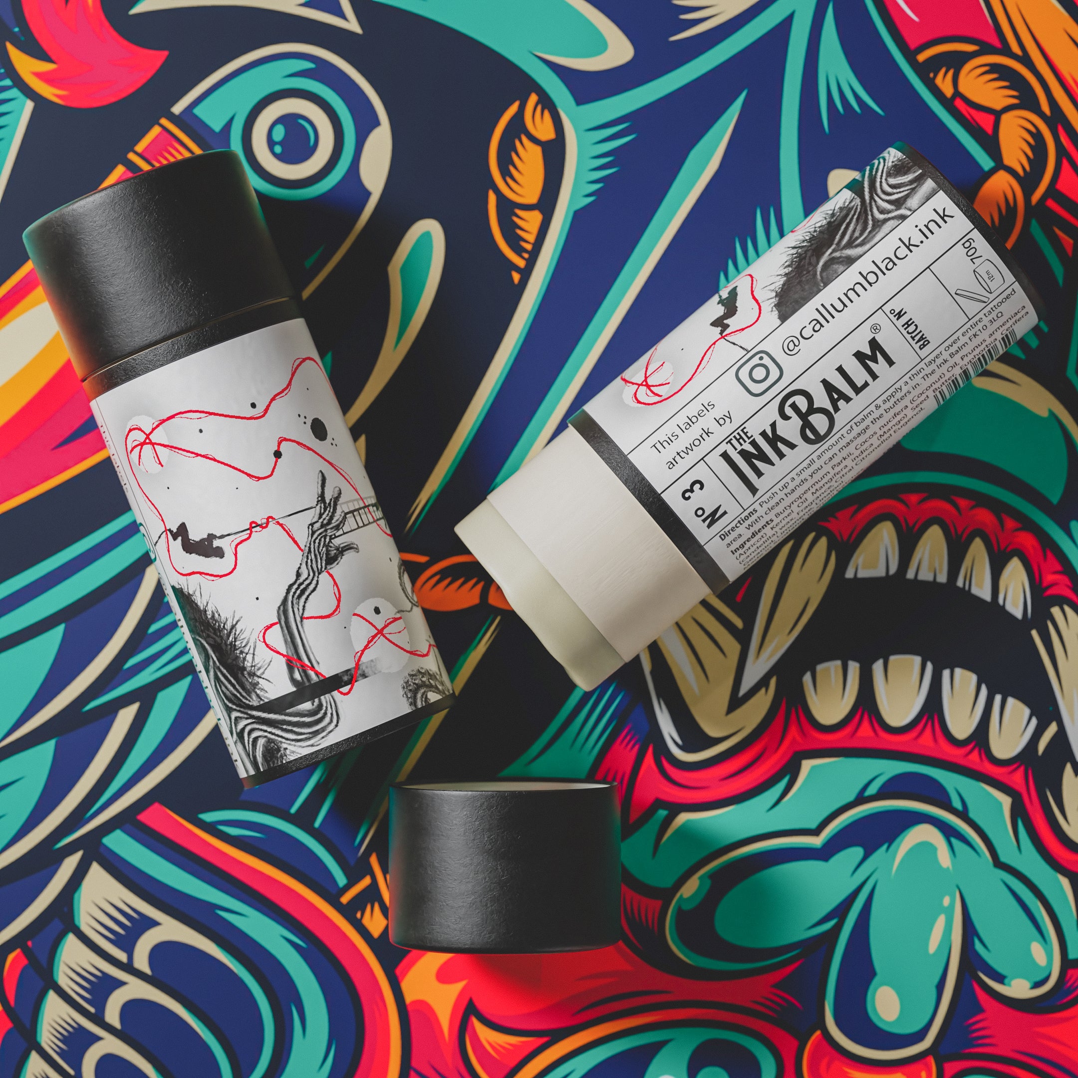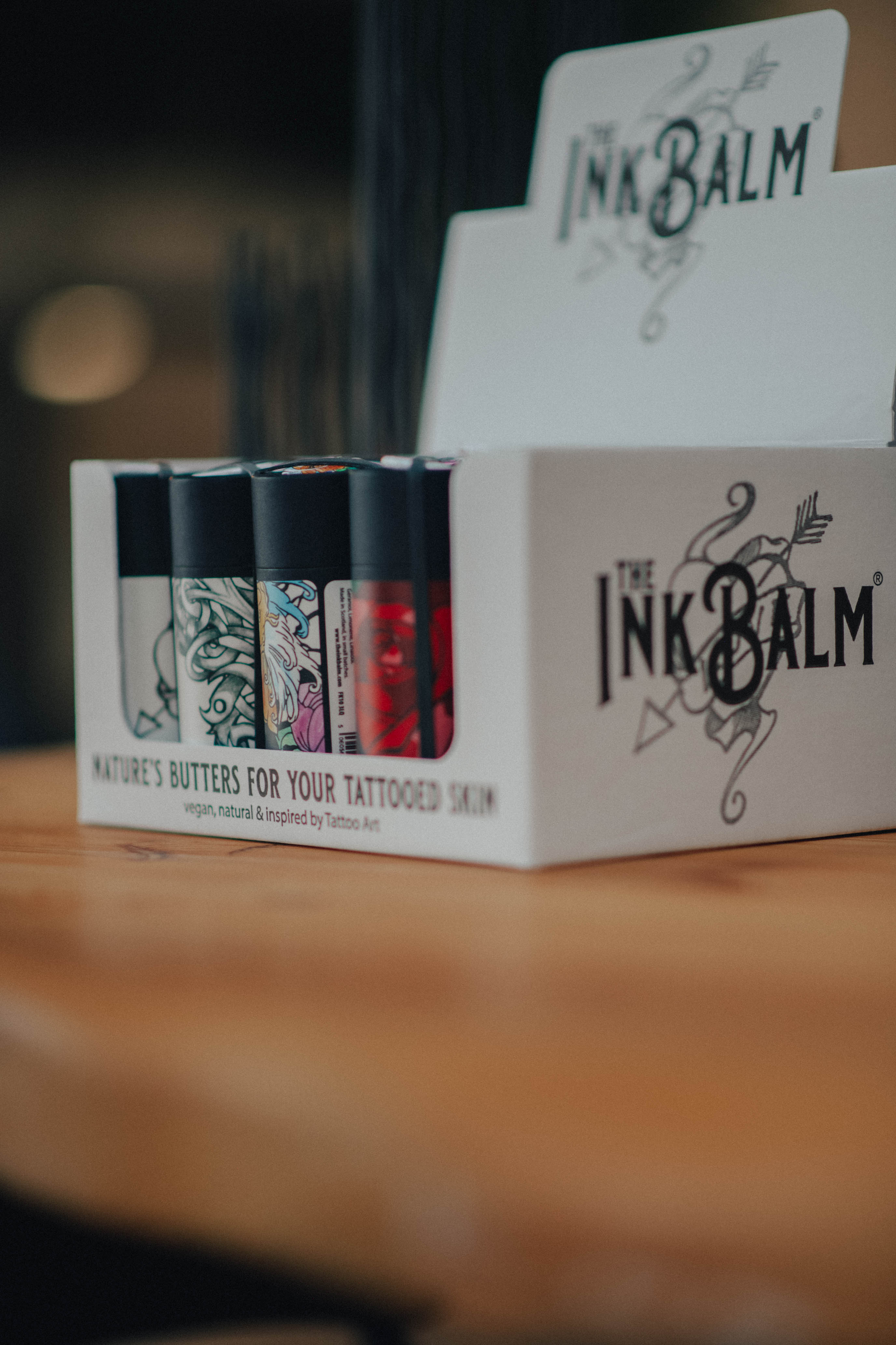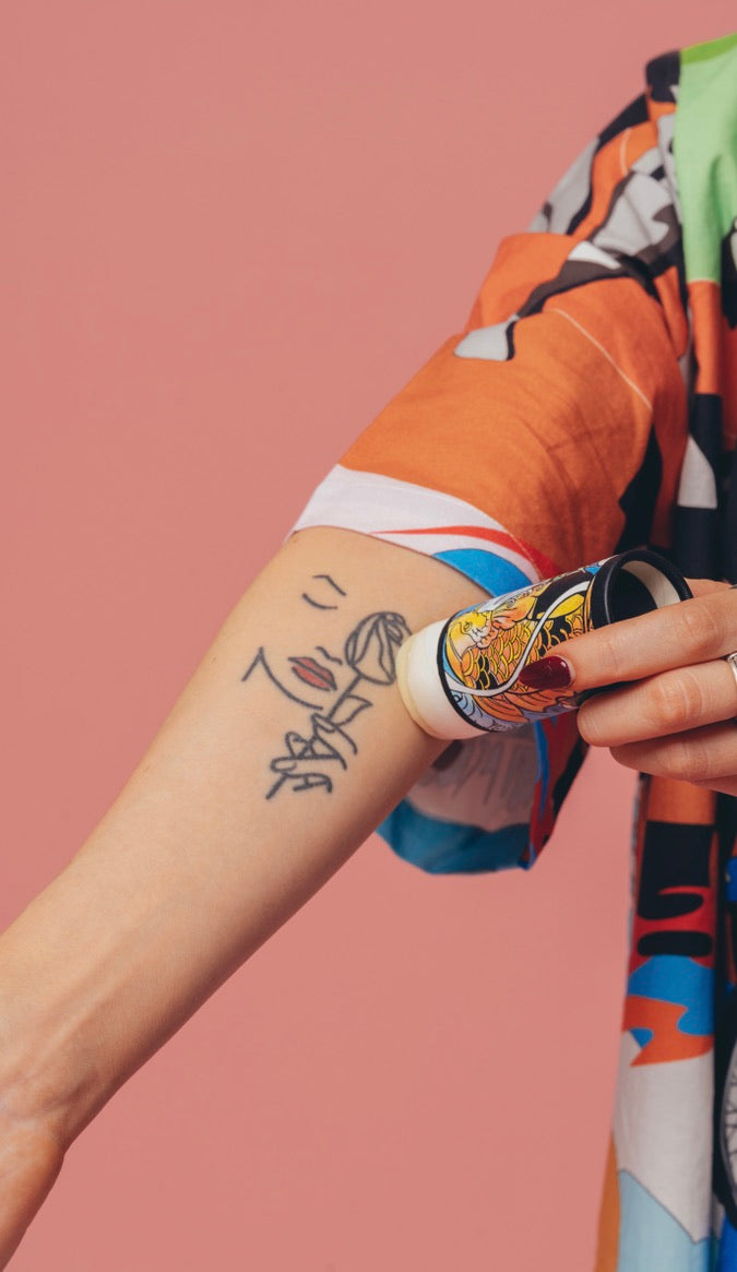 The Ink Balm is presented in a recyclable cardboard tube. Simply push up the stick of balm and apply it to your tattoo, keeping it hygienic and easy to use when you are out and about.