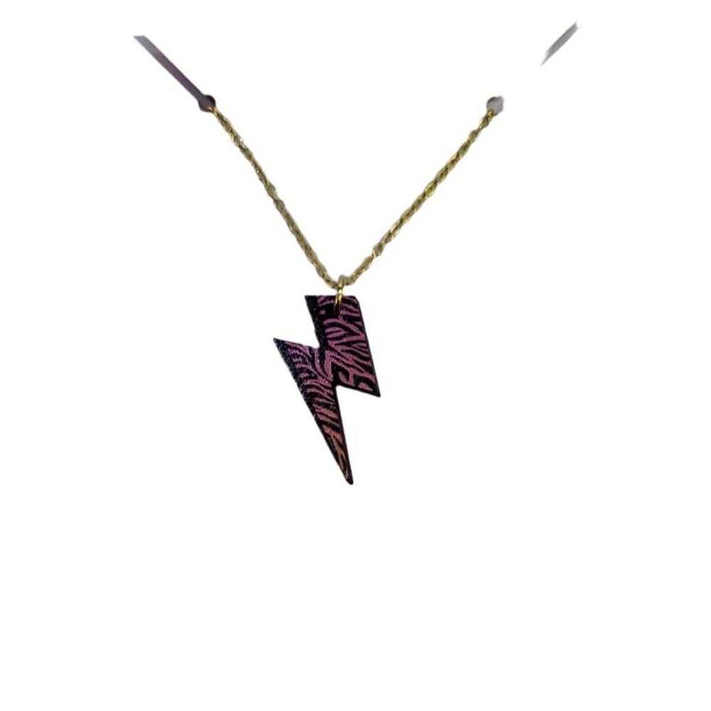 The lightning bolt measures 22mm in length. It is made from responsibly sourced maple-veneered wood and hangs on an 18-inch delicate gold-plated chain.