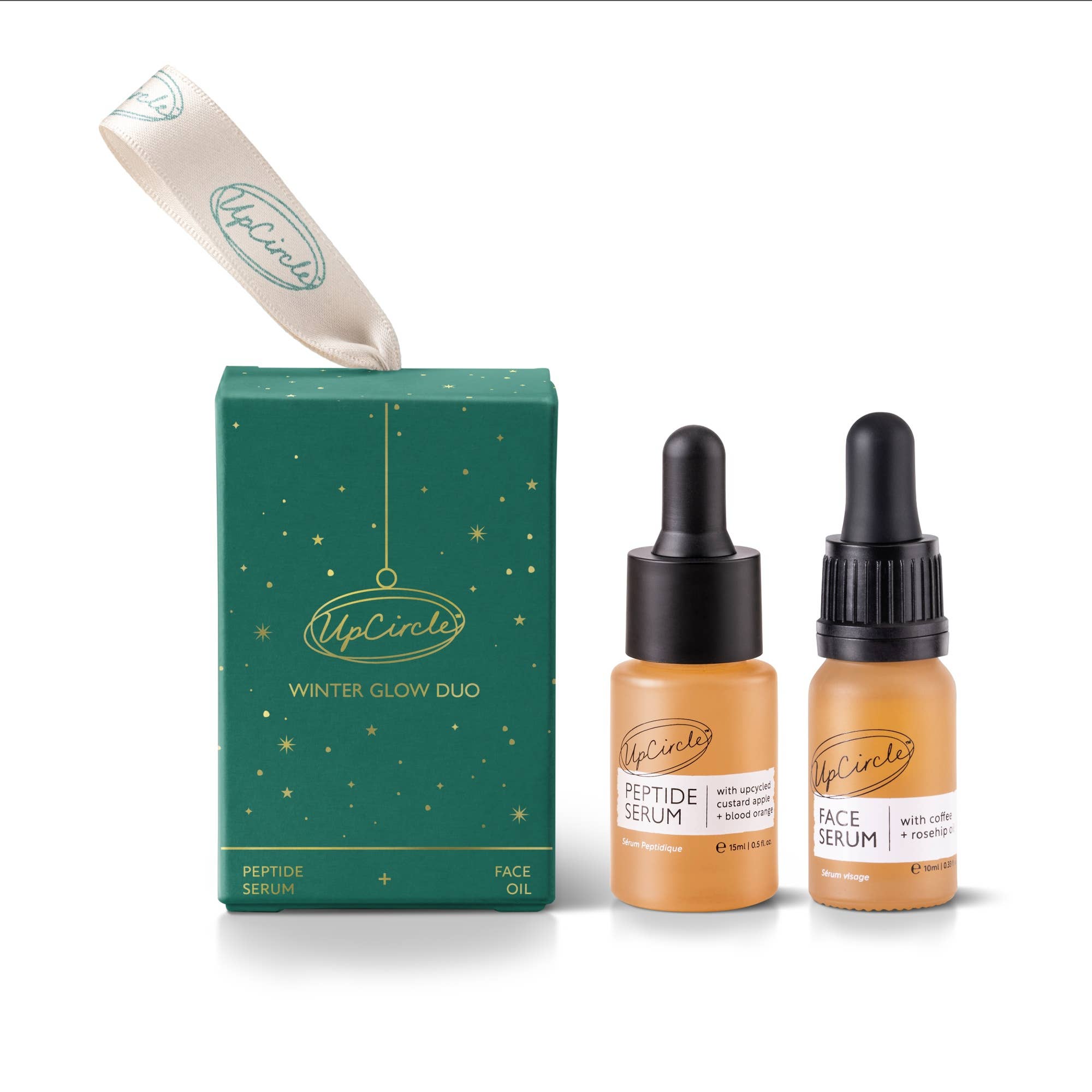Meet the 'Winter Glow' Bauble! Tucked inside a luxury green & gold bauble, with a built-in saving are 2 mini unisex cult-classics: - Peptide Serum, 13ml - Organic Face Oil, 10ml An award-winning duo to keep skin hydrated throughout the colder months, the gift that keep on glowing! Sustainable gifting-ready, with a ribbon made from recycled plastic you don't even need to wrap.