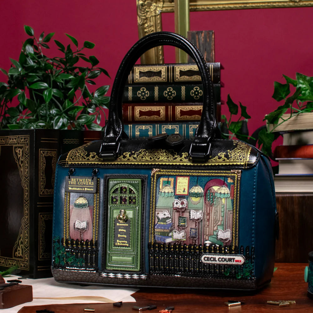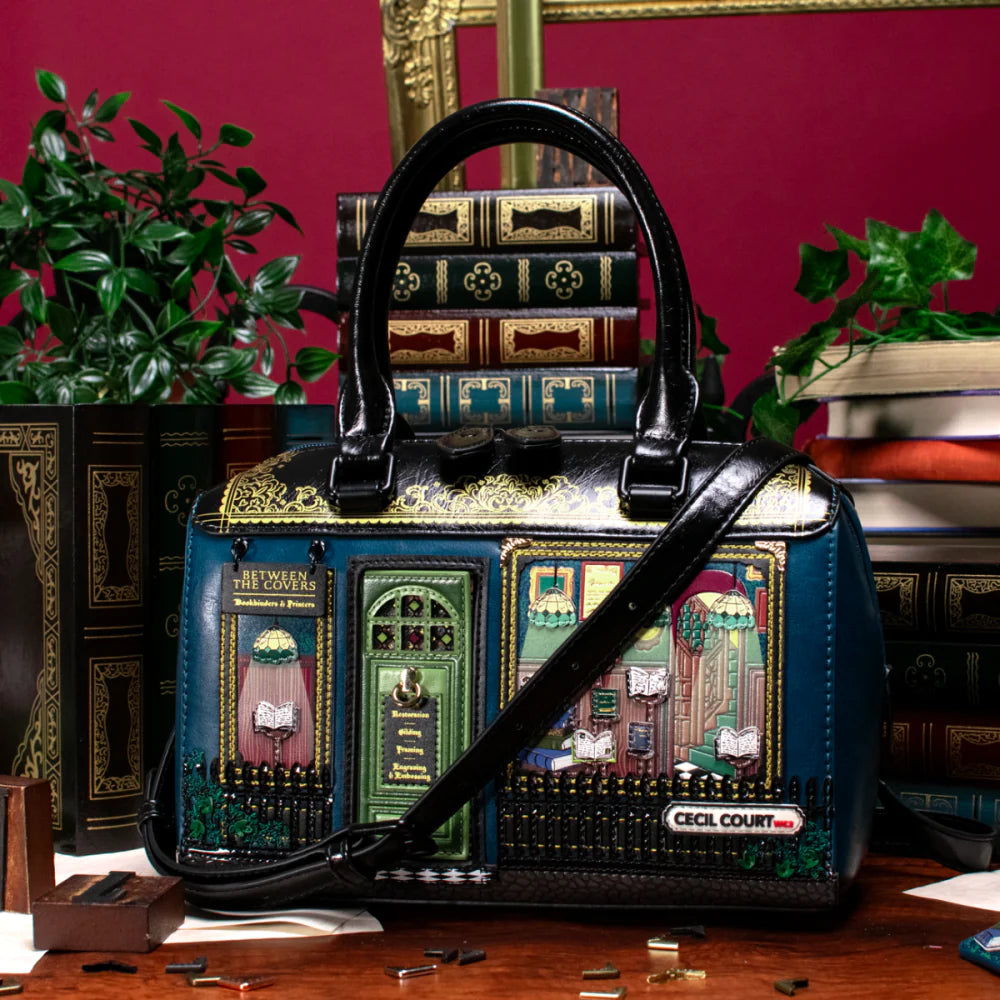 The Between the Covers Bookbinders Speedy Bowler Bag is the perfect companion for the new season. This elegant, vegan leather bag is ideal for everyday use and comes with a comfortable handle and strap for versatile carrying. Its roomy, zip-secured compartment will fit all your essentials. Featuring a charming vintage bookshop-themed design with printed and appliqué elements, this bag adds effortless style to any autumn/winter outfit.
